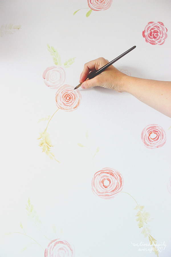 Originally I was using thicker paint (like with the dark flower in this photo), but as I went, I found I liked the subtle, transparent look. So while I didn’t water down my paints TOO much (we don’t want drippy walls!) I did ease off the thickness as I went.