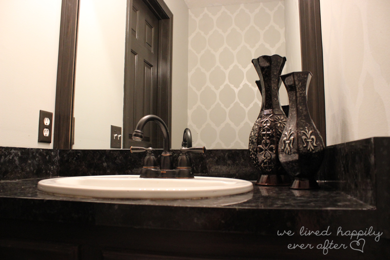 My parent’s guest bathroom was in need of some real love. With zero natural light & ugly builder grade everything, we had our work cut out for us… and believe it or not, on a budget of under $100 this is what it was transformed into. The projects included in this bathroom redo were the counter tops ($25), refacing the cabinets, framing the mirror, and painting & stenciling the walls (Tutorial for my free hand wall stencil found here)
