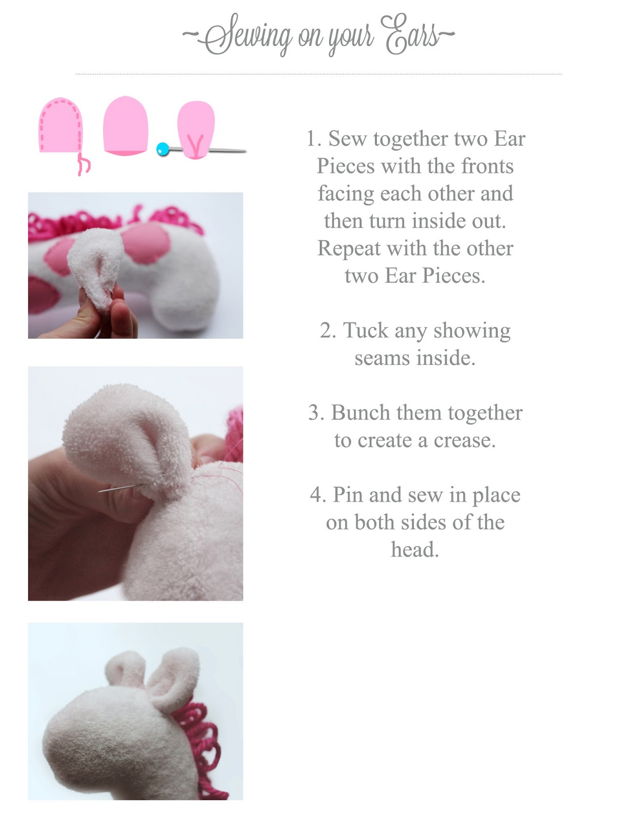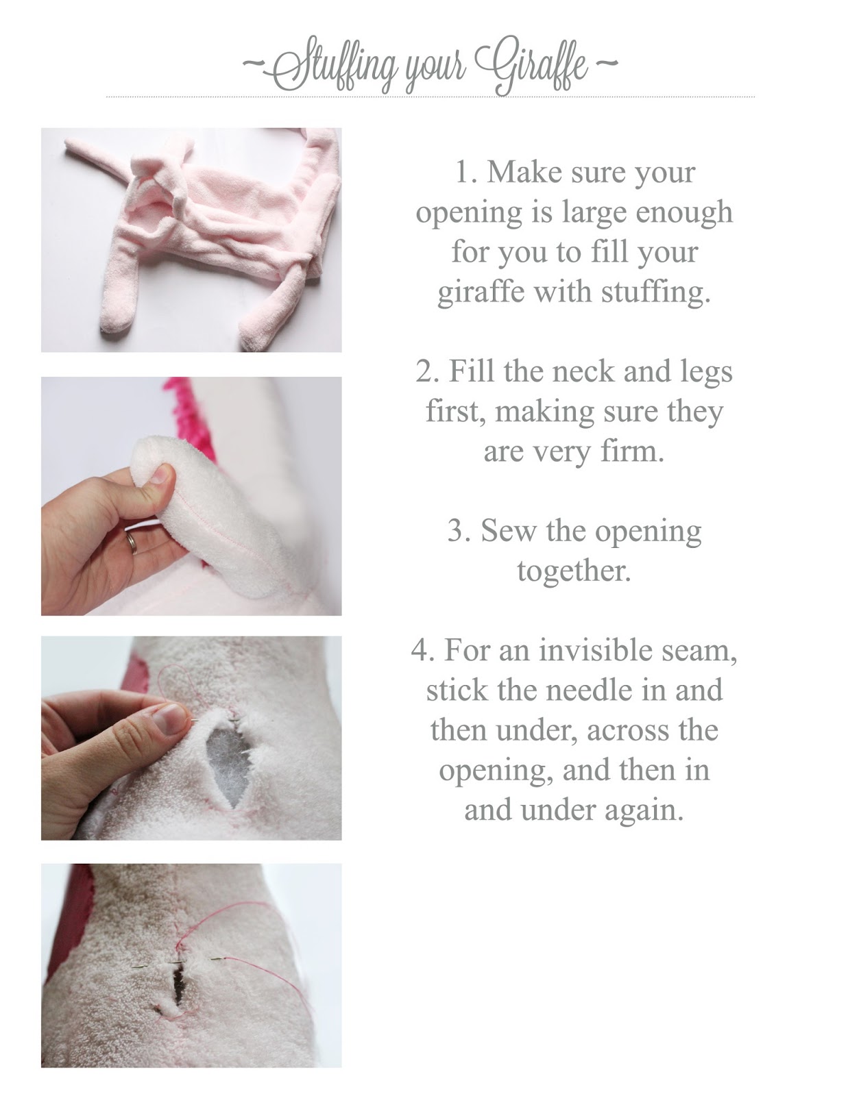 this is adorable. I am making one out of faux giraffe fur for my daughter, with a matching blanket and slippers. She's going to love it for Christmas!! I was wondering what your seam allowance was for this project? Also, on the cutting, you may want to add that the pieces that need two cuts (body, legs, ears), should be cut as opposites, or fold the fabric in half before cutting. I think most of us know this, but it helps people remember better when it is written. I am a bit absent minded, and almost cut two facing the same way 🙂 I can't be the only overtired, foggy-brained mom out there 🙂 Thanks SO MUCH for this pattern!!
