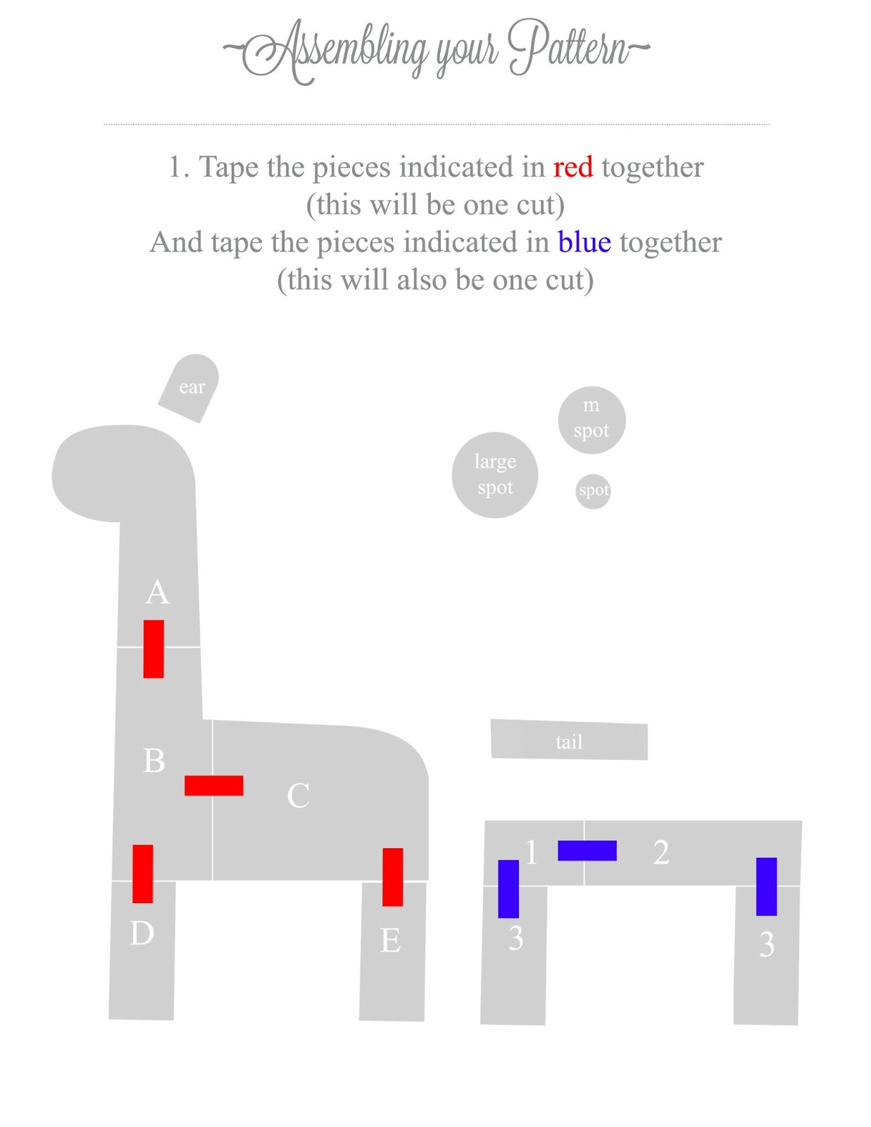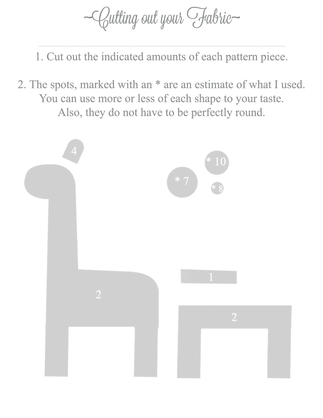 The above pattern pieces and the following materials & instructions make a 20″ tall (tummy to ears) 20″ long (tip of leg to tail) Stuffed Giraffe.