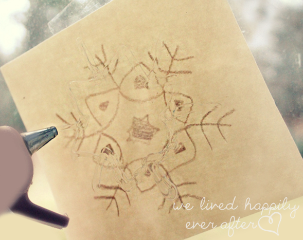 I have made snowflakes with glue, but I am trying to remember what I made it on, like maybe parchment paper and then stick them on the window. I am going to have to try this. Could tape the snowflake from whatever image you have on the outside of he window and then do the inside with the hot glue gun (cool temp glue).